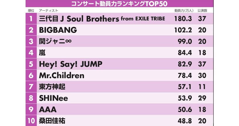 コンサート動員力 三代目が1位 嵐や関ジャニ は 日経bizgate